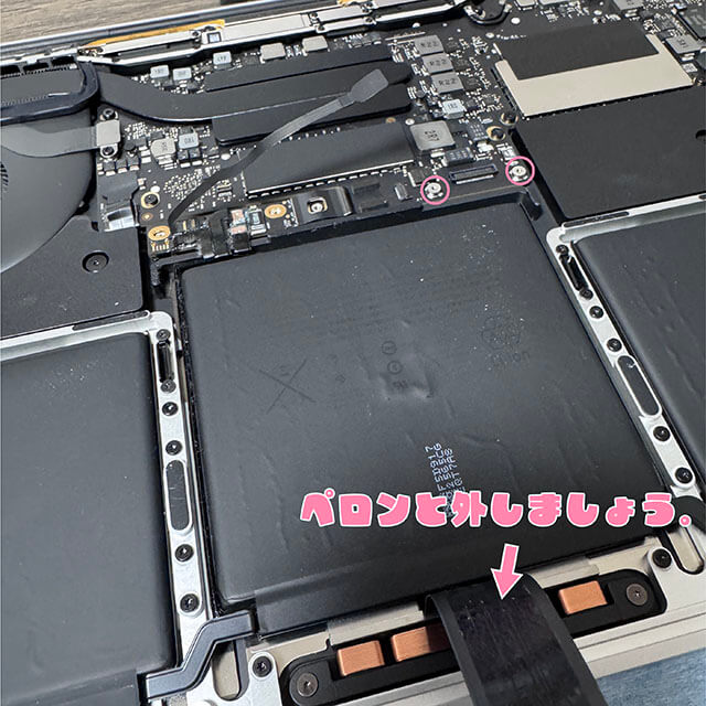 左右のバッテリーを剥がし終わったら、真ん中のバッテリーを剥がしましょう。