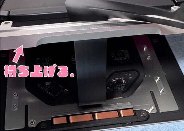 本体を持ち上げて、トラックパッドを下に引っ張り出して外しましょう。