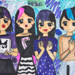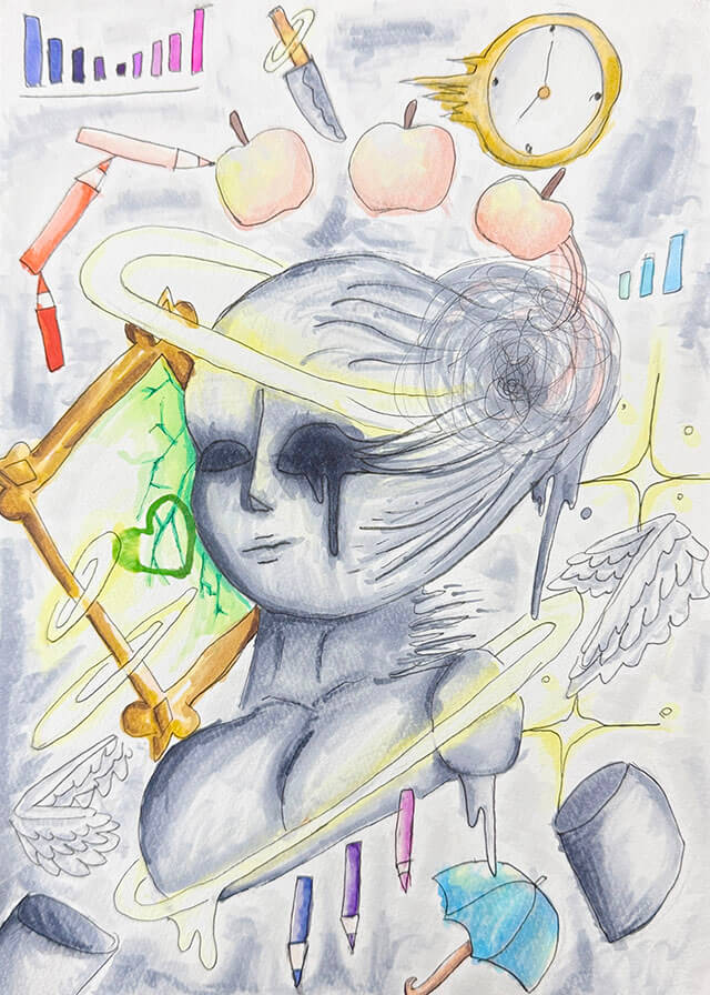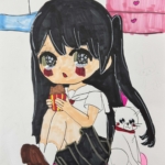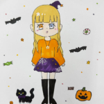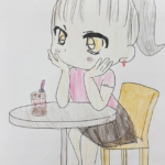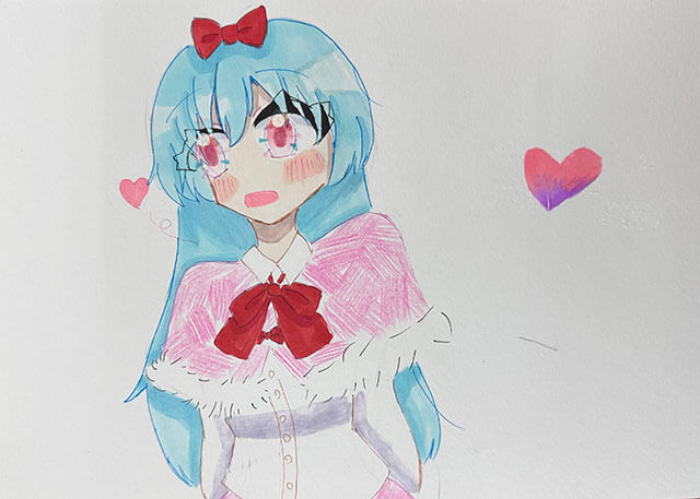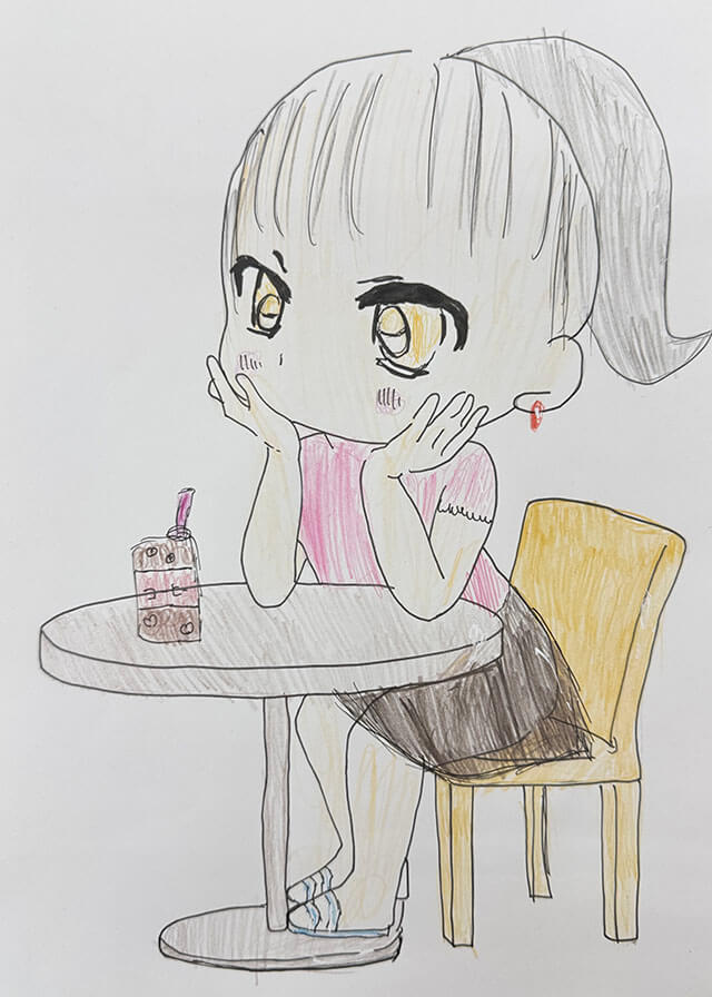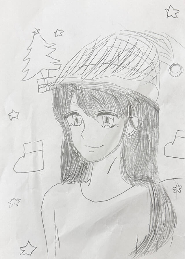 - 少し横を向いている顔を描く課題です。とても可愛い女の子を描くことができましたね!!背景にも色を塗っていて◎