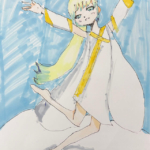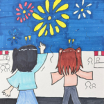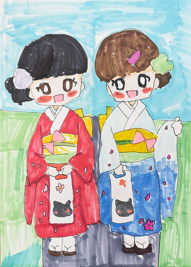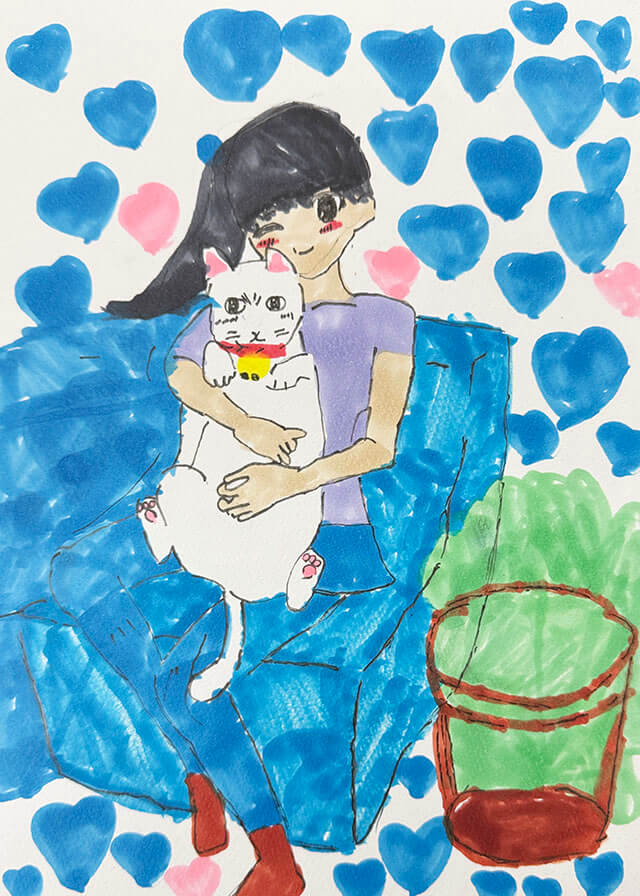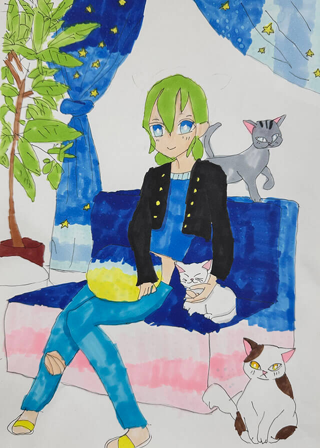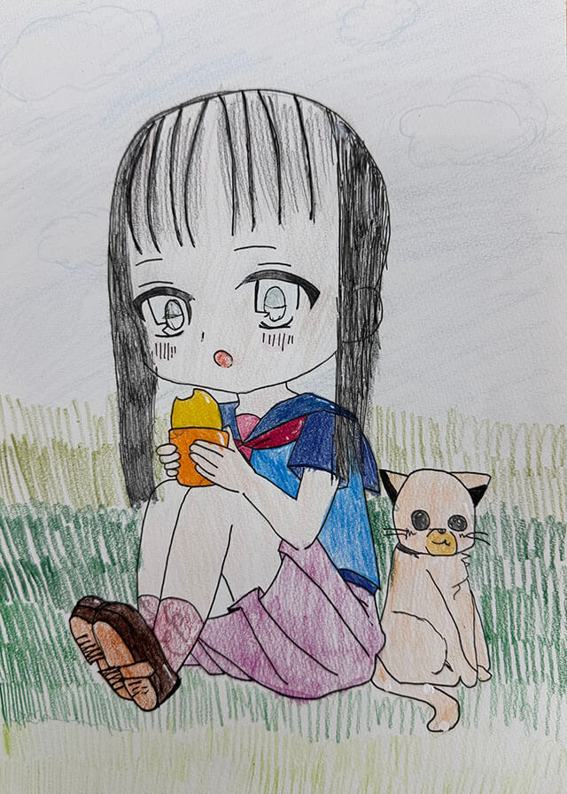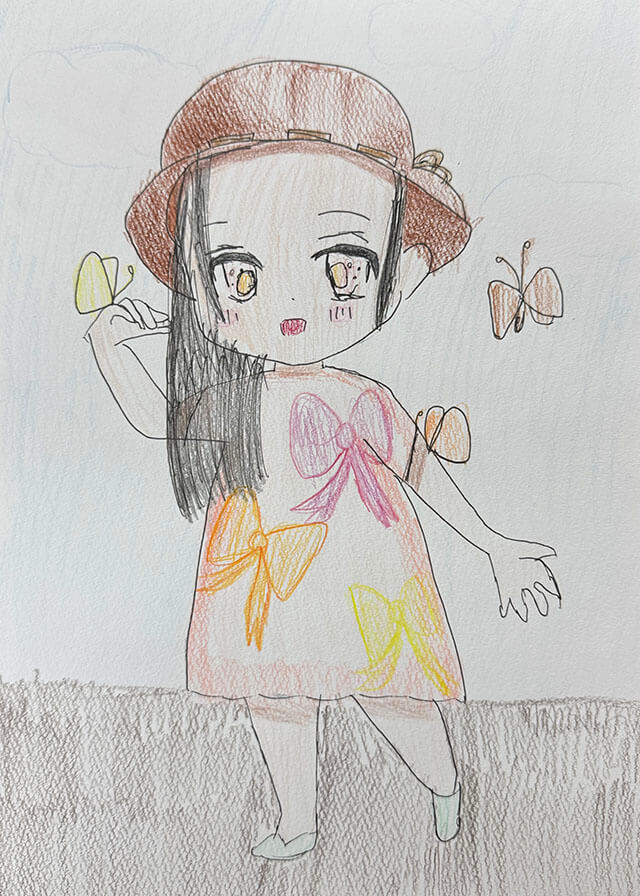 - 全身を描くのは難しいですが、頑張って描きましたね。背景もきちんと描いていて、どこの場所にいるのかがわかりますね。夏らしい爽やかな作品です。