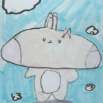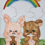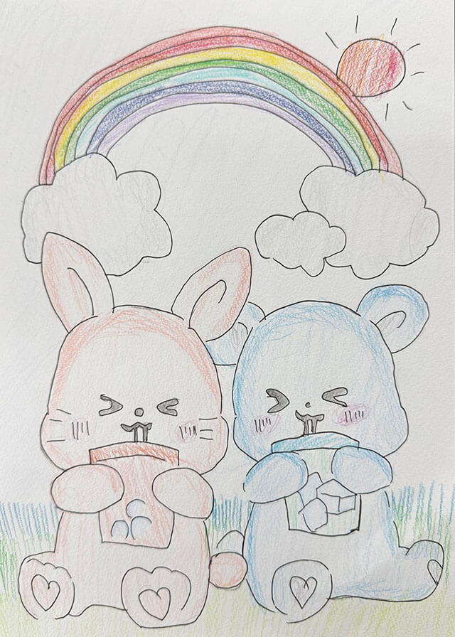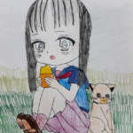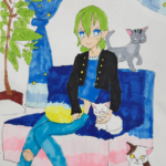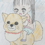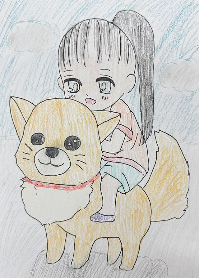 - コピックをたくさん練習していましたね。同系色でまとめられているシンプルな作品です。ワンちゃんの色のムラが、毛のふわふわ感につながっていて◎
