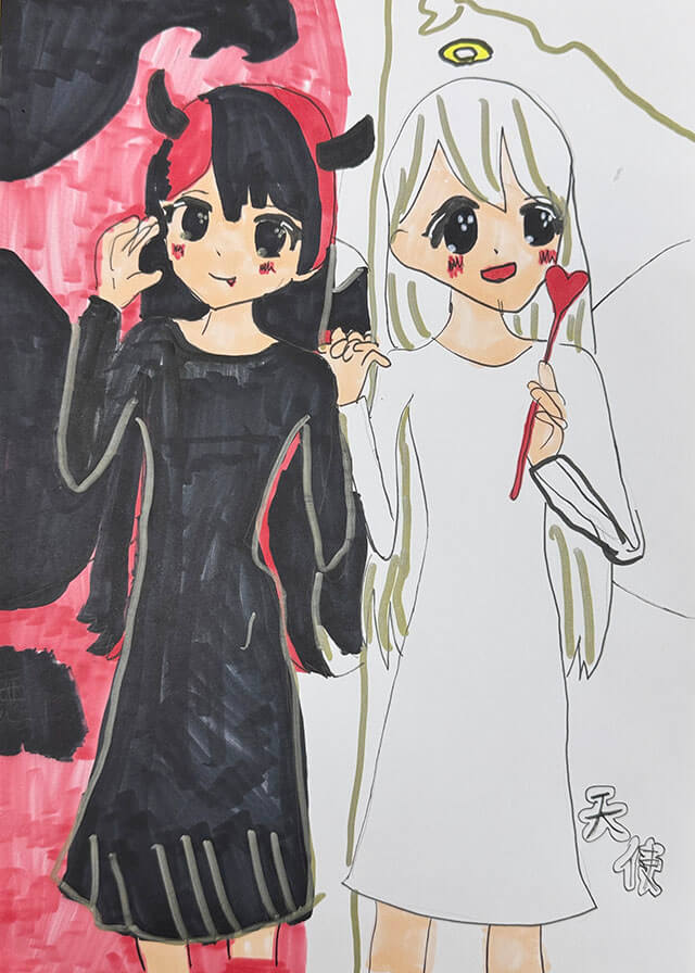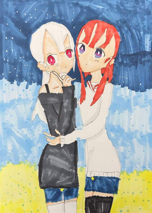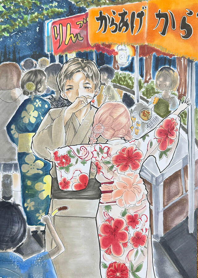 - 夏をテーマにした課題です。手前と奥に女の子を描いていて、距離感を表現できています。