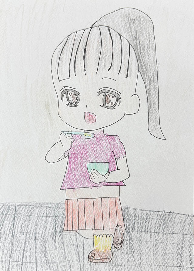 - 難しいポーズに挑戦していて素晴らしいです!ご飯が美味しそうに描けています(^^)