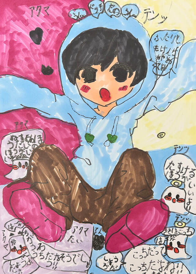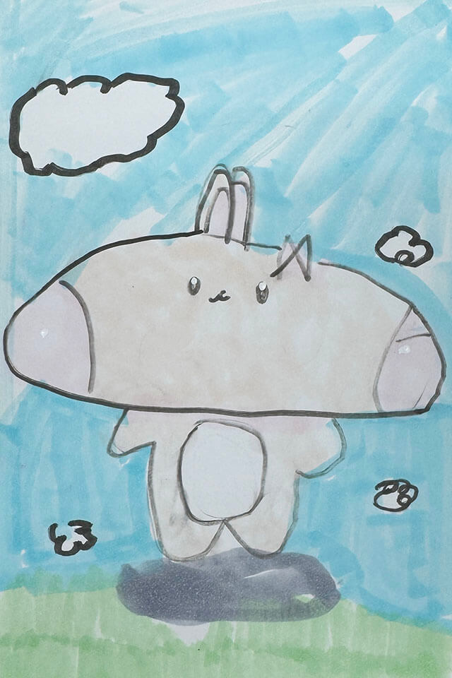 - 味のある線が魅力的な作品です。可愛いだけじゃない何かが伝わってくる作品です。独特な色のセンスが◎