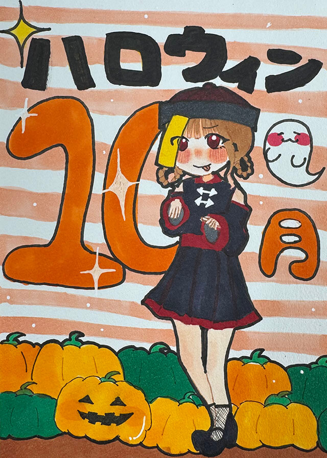 - ハロウィンをテーマにした課題です。ナースのコスプレをした女の子が血まみれですね。ホラー感が出ていて◎新たな世界観に挑戦していますね(^^)