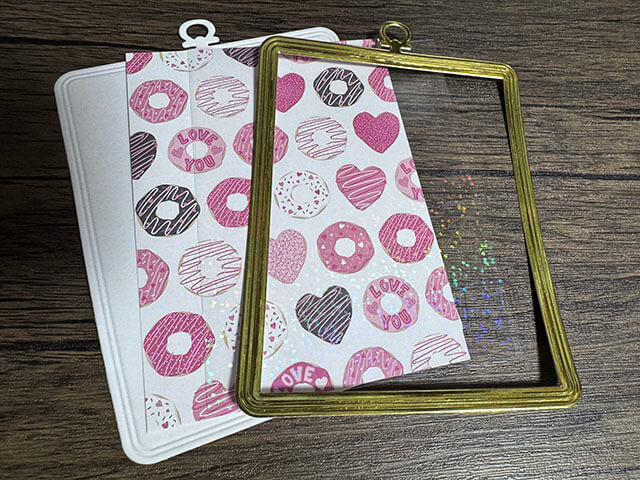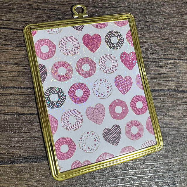 画用紙の上にデザインペーパーを貼り、キラキラフィルムを貼り、最後にフレームパーツを貼ります。